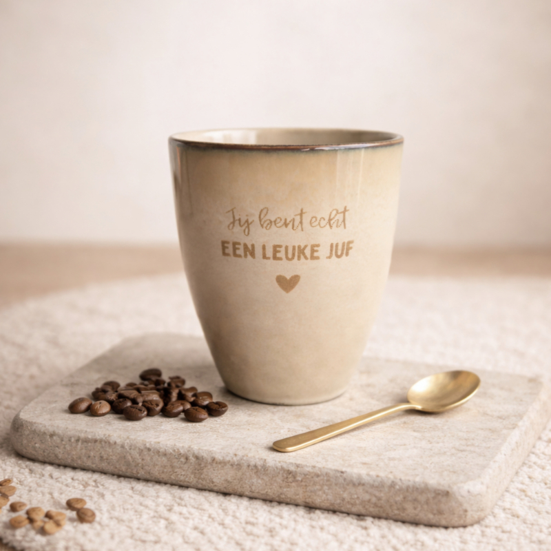 Labelgeluk mok | jij bent echt EEN LEUKE JUFElegant, modern en tijdloos. Dat is deze mok in de kleur beige. De mok is gemaakt van aardewerk en heeft een prachtige natuurlijke coating. Deze beker met een diameter van 8,5 cm en een inhoud van 315 ml is perfect om te genieten…